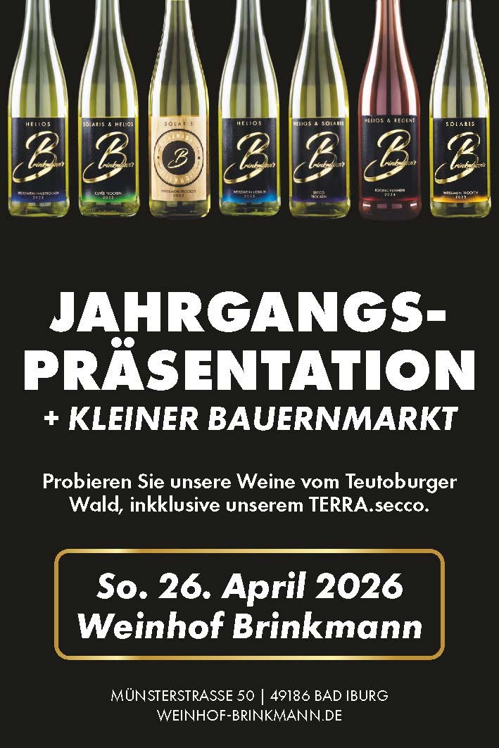 Ein besonderer Termin für Genießer, Neugierige und Freunde regionaler Landwirtschaft: Am Sonntag, 26. April 2026, lädt der Weinhof Brinkmann erstmals zur öffentlichen Jahrgangspräsentation auf den Hof an der Münsterstraße 50 in Bad Iburg ein. Zwischen 11 und 18 Uhr erwartet die Besucher ein genussvoller Tag rund um Wein, Regionalität und die Geschichte des Bodens, auf dem alles wächst.